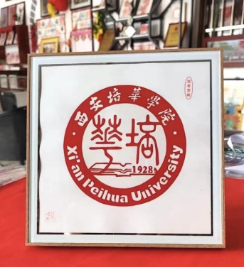 沉浸式地学习体验中,成员们也在思考怎样才能“艺术+”传承非遗赋能乡村振兴。在经过激烈地讨论后,决定尝试以“非遗+培华”的形式进行文化推广。这不仅开创了“宜君剪纸“非遗首次与校园文化的深度融合,创新了剪纸的内容与形式,也赓续维之精神,续写培华新章。在经过与赵冯拴老师的沟通后,初步构思设计了“非遗录取通知书”式的合作计划。赵老师还以西安培华学院校徽为原型,设计并制作出了“宜君剪纸”式非遗校徽,其精细程度让同学们不断赞叹。