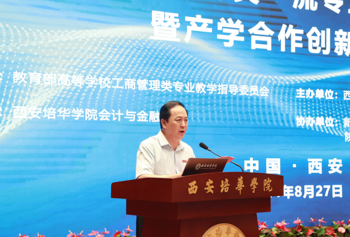 为深入探讨会计类一流专业高质量发展新路径,交流产学合作发展的新思路,2024年8月27—28日,由教育部高等学校工商管理类专业教学指导委员会指导,西安培华学院、西安交通大学城市学院、西京学院三所高校主办,西安培华学院会计与金融学院承办,新道科技股份有限公司、沈阳跃客教育科技有限公司、陕西中鸿财税研究院有限公司协办的“共商 共建 共享 共赢—民办高校会计类一流专业高质量发展暨产学合作创新大会”在大赢家棋牌。来自省内外20余所高校的教师代表、企业代表、学生代表400余人参加了本次会议。本次大会分为三个环节,27日上午为专家主题报告,下午为高校专业建设及校企合作专题研讨,28日上午外出访企进行参观考察。