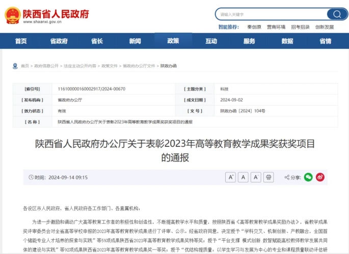 教育教学成果奖是陕西省高等教育教学领域的最高奖项,是对学校人才培养工作和教育教学改革成果的检阅和展示,本次获奖是在学校理事会和学校党政的坚强领导下取得的凝聚了学校教师在教育教学工作实践中的不懈探索和拼搏奋斗,这不仅标志着学校在应用型人才培养上的深入探索取得显著成效,也进一步彰显了其在培养时代新人、推动高质量发展方面的坚定决心与孜孜追求。