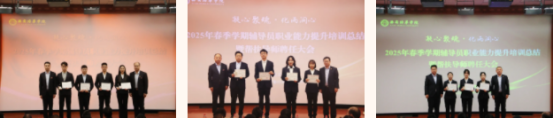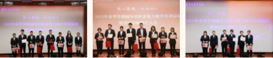 各二级学院书记为新入职辅导员颁发结业证书并赠送工作寄语纪念卡。帮扶导师为新入职辅导员佩戴了校徽并赠送了入职大礼包。