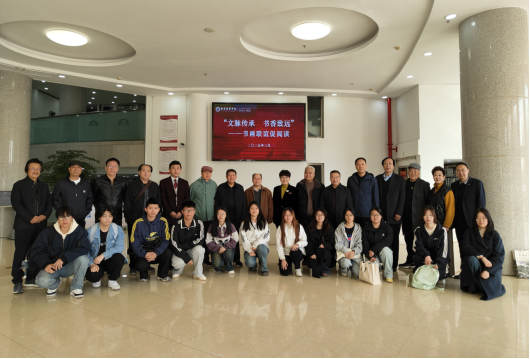 上午,书画家们如期走进校园,在图书馆三楼辅导员之家开展座谈交流,传媒与设计学院常务副院长徐莹、金融文化研究院院长赵晓舟、图书馆馆长闵波、金融文化研究院办公室主任刘艳菊及茂林书画协会的40余名书画爱好者参加了座谈会。