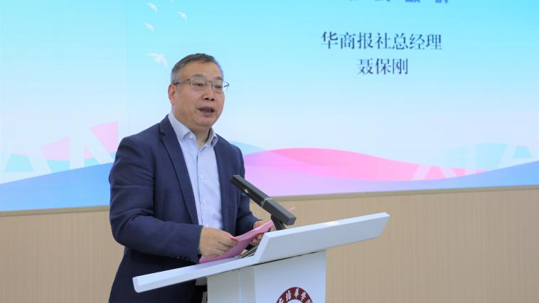 华商报社总经理聂保刚代表华商报社致辞,强调了媒体在教育信息传播中的独特作用,并提出了媒体与教育融合的创新路径。