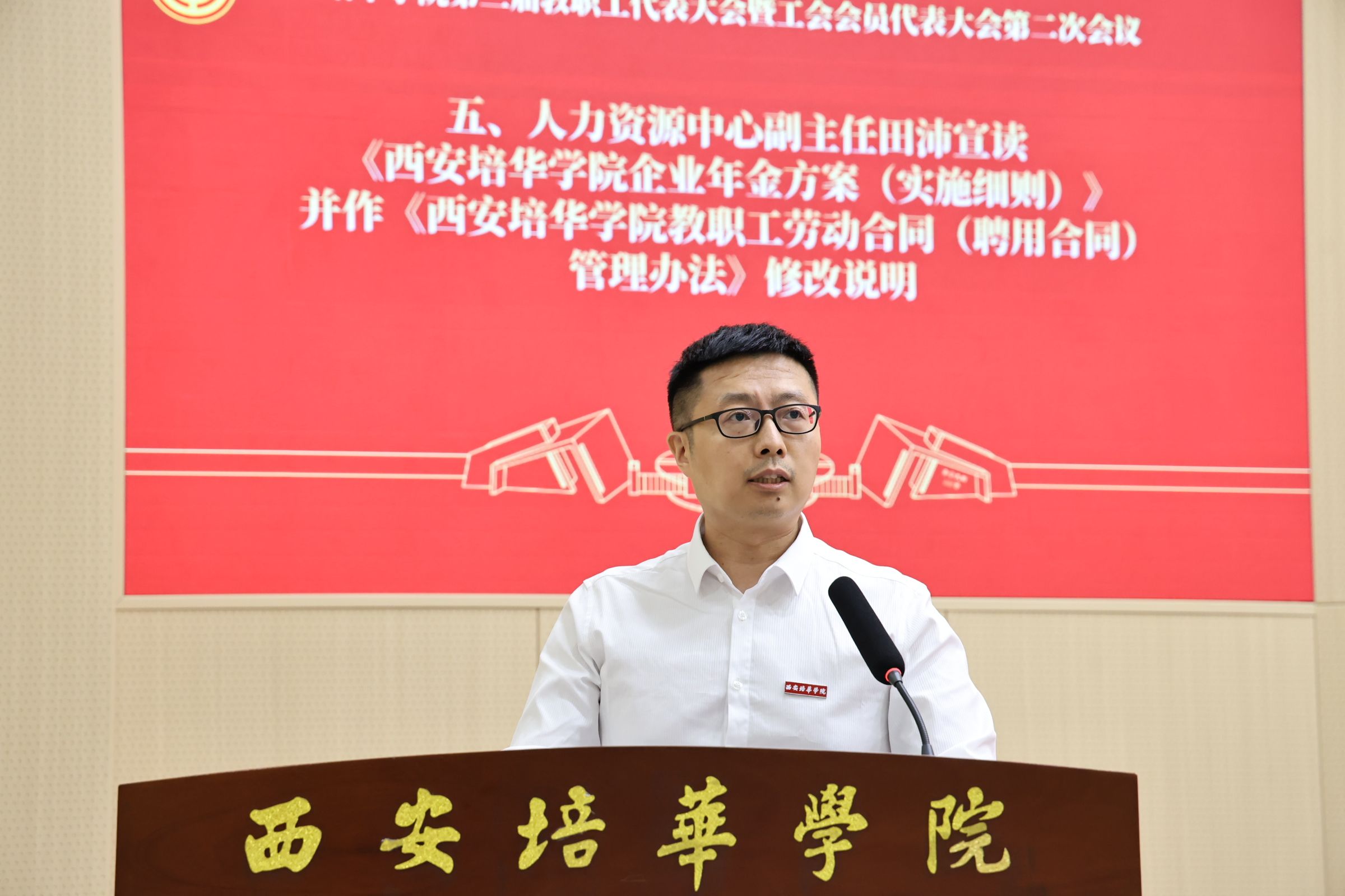 田沛宣读了《西安培华学院企业年金方案(实施细则)》,并详细解读了《西安培华学院教职工劳动合同(聘用合同)管理办法》的修订内容。这两项制度的完善旨在进一步健全教职工福利保障体系,规范人事管理,保障教职工合法权益,促进和谐劳动关系建设。