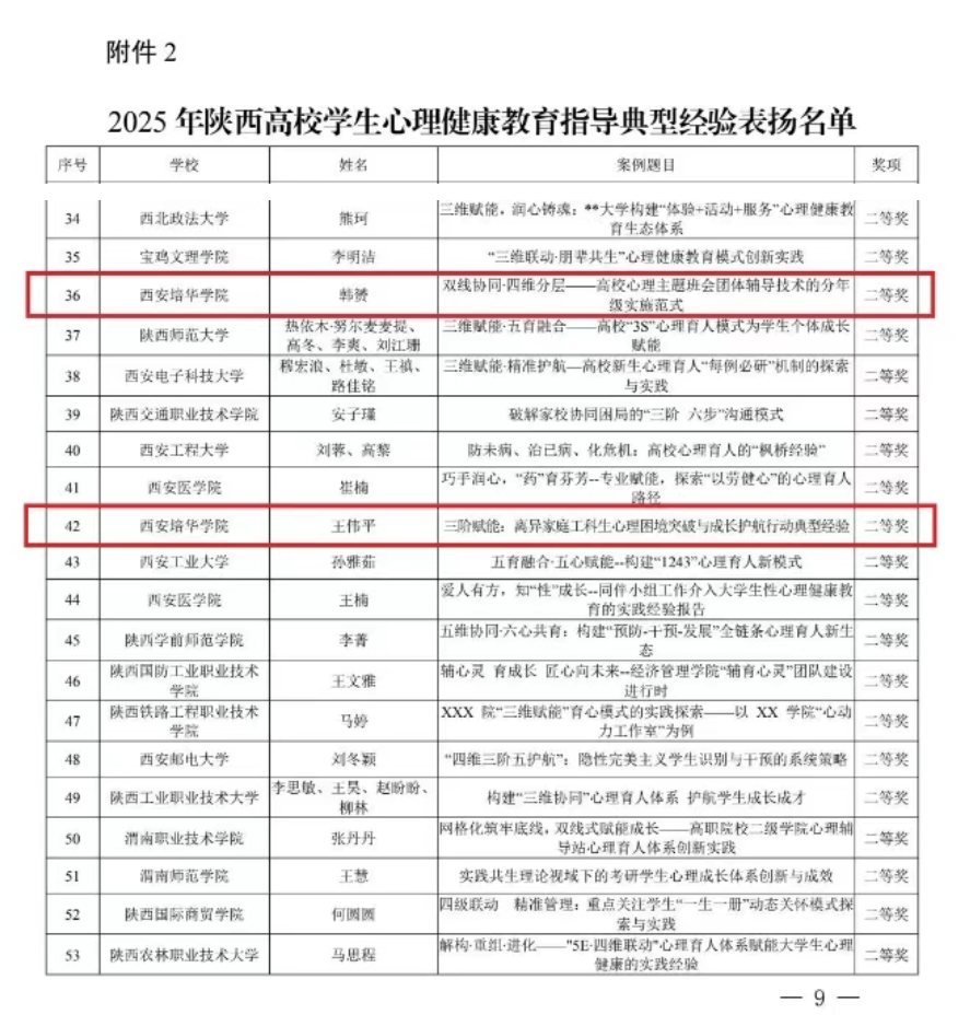 创新凝练“培华范式”。学校在教育教学、咨询服务、实践活动、预防干预、平台保障五大领域持续探索创新,形成了《“五心同筑、双元互动、五育并举”高校525心理育人工程的实践与创新》《“AI + 六阶”护航大学生心理健康成长精准赋能行动的实践与探索》等省级学生工作精品项目。这些先进经验多次在全国及全省性论坛、会议、培训班上进行分享交流,近三年获得省级以上教学竞赛、典型案例、专项活动等奖励40余项,为学校高质量内涵式发展注入了强大的心理动力。