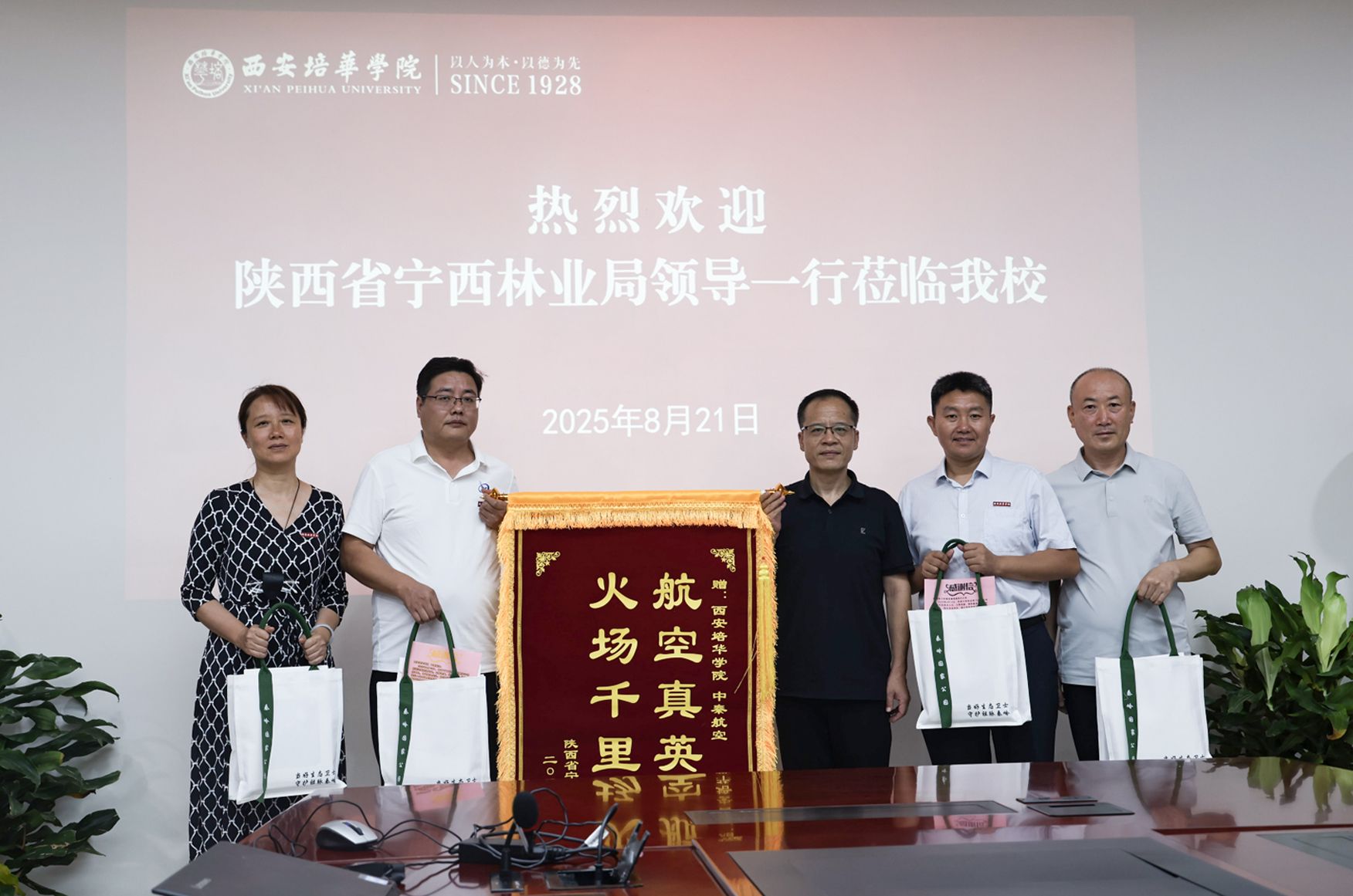 8月21日上午,陕西省宁西林业局副局长杜雷军一行来到西安培华学院,向学校及战略伙伴中秦(西安)航空有限责任公司送上“火场千里眼,航空真英雄”锦旗,对双方在今春秦岭森林火灾扑救中的科技驰援表示感谢。合作发展中心主任柳雨、中秦(西安)航空有限责任公司领导出席座谈。