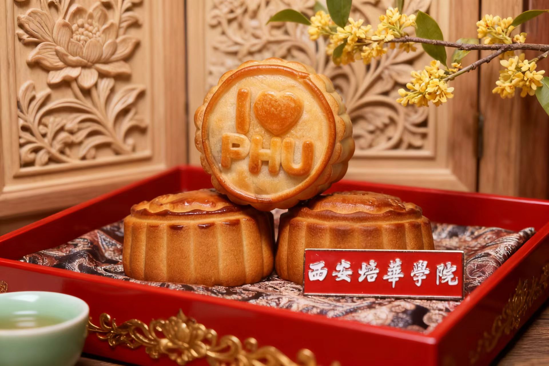 培华定制·情意绵长——这份承载着学校深情的月饼,不仅口味丰富,更藏着独属于培华的“浪漫密码”。此次定制月饼包含三种口味、两种样式:蛋黄莲蓉月饼、御品草莓月饼、御品红豆沙月饼;图案造型一种印有“维之园”,一种印有“I ? PHU”。每一块月饼都是培华对学子独一无二的牵挂。