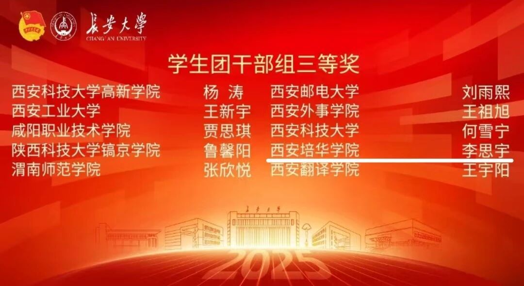 10月12日,由共青团陕西省委、中共陕西省委教育工委主办的第六届陕西高校团干部素质能力大赛总决赛暨颁奖仪式在长安大学渭水校区圆满收官,在这场全省高校团干部的“巅峰对决”中,培华团干以过硬的专业素养和昂扬的精神风貌,一举斩获四项大奖。