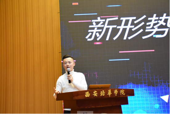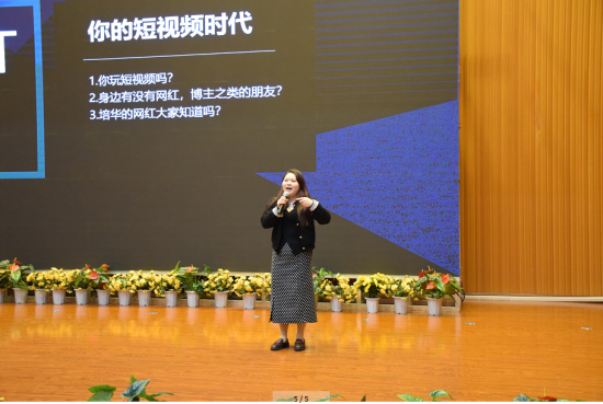 寇博老师是一位在抖音拥有百万粉丝网络达人,他通过分析“皮卡晨”、“冰蛋”等网红案例的共同属性,将抖音运营模式按照“直播带货”、“明星”、“娱乐主播”进行分类,让在场的师生形象的了解新媒体和新媒体的运营模式。