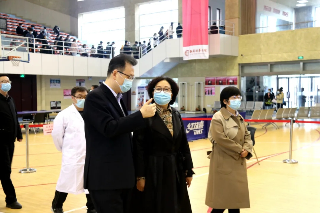 陕西省卫健委主任刘宝琴,陕西省中医药管理局局长、疾控中心主任刘峰,西安市卫健委主任刘顺智,市中医药管理局局长孟祥东,长安区政府副区长梁文辉,杨永涛,长安区疾控中心主任刘晓勇,西安培华学院理事长姜波一同参观并指导了培华的疫苗接种工作,领导们对接种流程的优化给予了肯定,对培华这次疫苗接种工作高度赞扬,希望各高校和区县以培华为标杆,并向培华的广大医护人员和志愿者学习、致敬!
