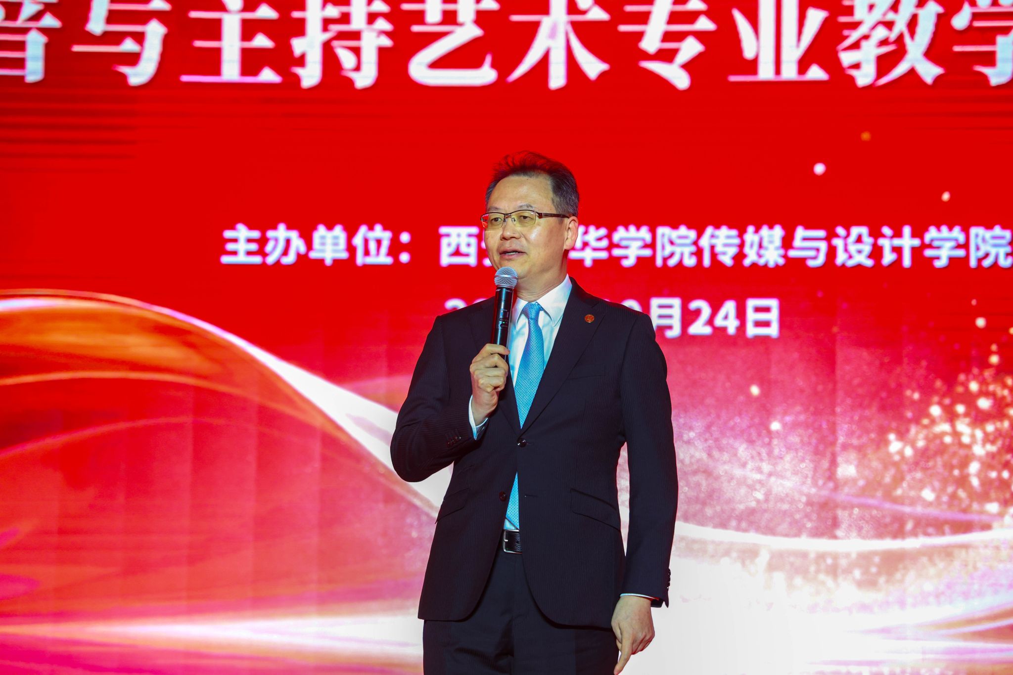 西安培华学院理事长姜波致辞。姜波理事长在致辞中充分肯定了播音与主持艺术专业所展现的深厚积淀与蓬勃生机,并对师生们在艺术创作与实践中取得的丰硕成果表示欣慰。他希望全体师生凝心聚力,持续创新,共同书写专业发展的新篇章。