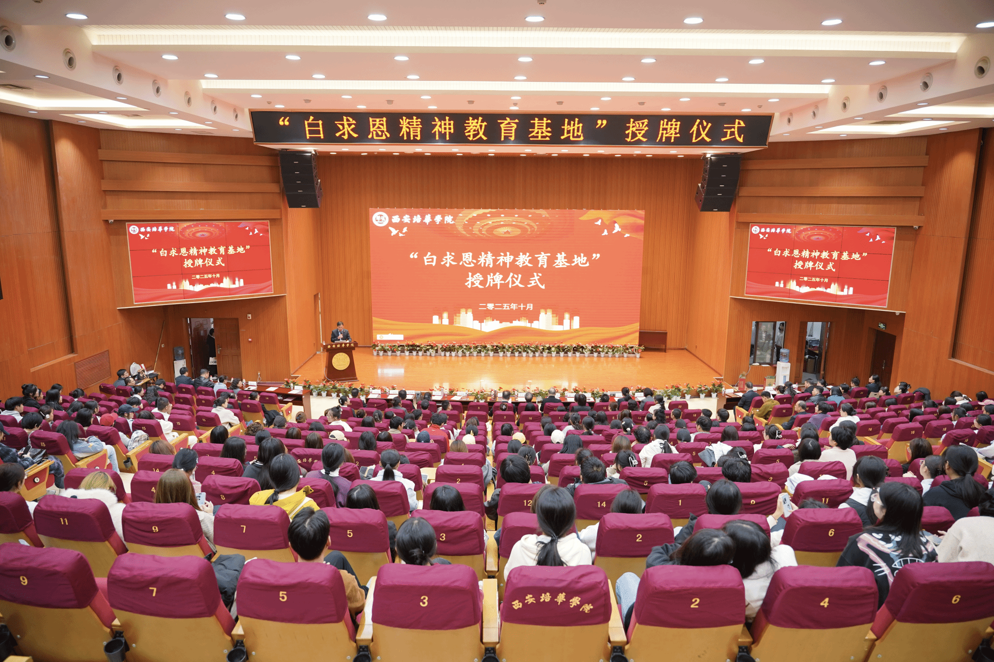 10月29日下午,西安培华学院长安校区图书馆三楼报告厅举行“白求恩精神教育基地”授牌仪式。白求恩精神研究会袁永林少将(原会长、原解放军总后勤部卫生部副部长)、穆广态少将(副会长、原武警宁夏总队医院院长)、陈天平执行副会长(原武警后勤部战勤局副局长)、董书魁副会长(原第二炮兵总医院检验中心主任)、刘建涛副秘书长兼办公室主任,以及特邀专家胡继红教授(国家卫生健康委员会临床检验中心)、万海英教授(上海同济医院)等一行领导莅临指导,西安培华学院理事长姜波博士、医学院院长扈国栋、党委书记兼行政副院长史立军、教学副院长王菊宁、党委副书记王江茹、医学检验系主任苏明权、医学检验系专业带头人赵亚以及师生代表共同出席活动,仪式由医学院院长扈国栋主持。