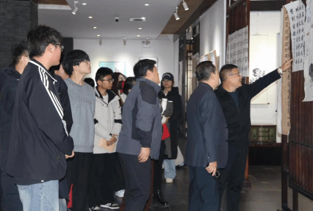 嘉宾与师生移步展区,品鉴软笔、硬笔书法及绘画作品的艺术魅力。即兴创作区墨香四溢,嘉宾与爱好者挥毫交流,尽显书画艺术的互动活力。