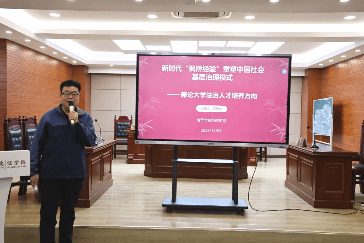 为了深入学习贯彻党的二十届四中全会精神,全面落实“十五五”规划关于法治建设的决策部署,切实提升师生法治素养与理论水平,2025年12月8日下午,在法学院模拟法庭,西安培华学院特聘教授梁相斌以“新时代‘枫桥经验’重塑中国社会基层治理模式——兼论大学法治人才培养方向”为题,深入分享了对基层治理创新与法治人才培养的独到见解。讲座由学校常务副校长胡俊生主持,法学院领导班子成员及部分师生共同参与。