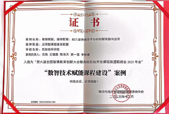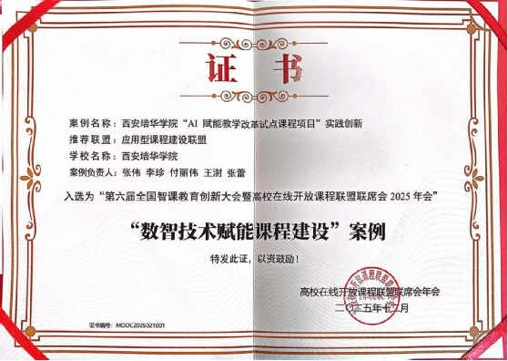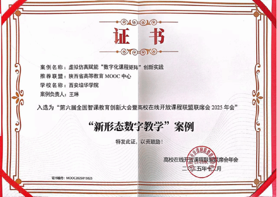 会上,《智慧慕课行动宣言》正式发布,为教育创新指明了方向,在优秀案例表彰环节,学校入选三个案例,其中,《西安培华学院“AI赋能教学改革试点课程项目”实践创新》《数智赋能,趣学配餐;幼儿营养教学平台的创新实践与应用》案例入选 “数智技术赋能课程建设案例”,《虚拟仿真赋能“数字化课程矩阵”创新实践》案例入选“新形态数字教学案例”。