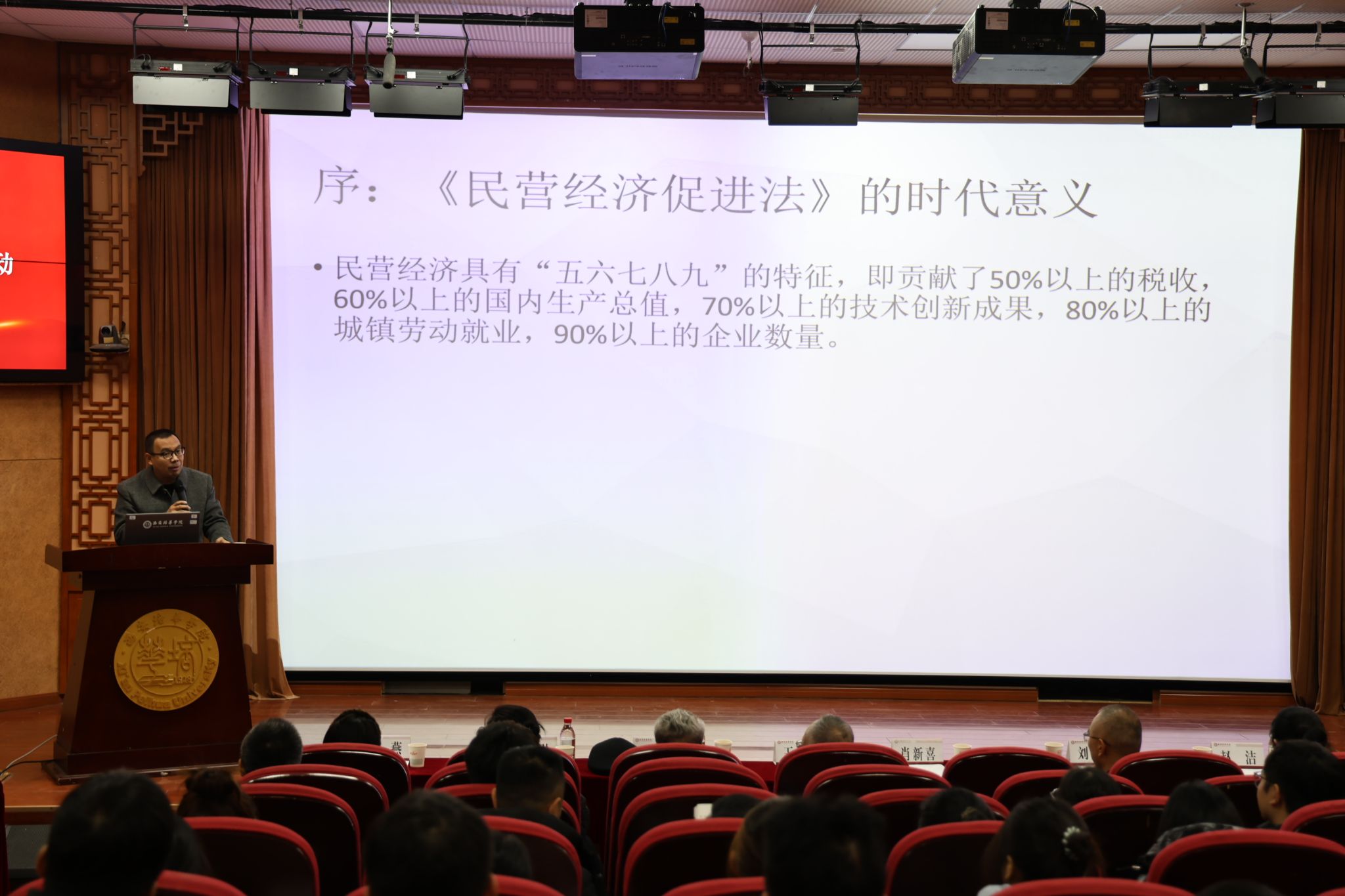 在专题讲座环节,西北政法大学肖新喜教授带来了题为《民营经济促进法解读》的精彩分享。肖教授从平等、全面法治、社会责任三大理论维度剖析法律核心要义。他指出,《中华人民共和国民营经济促进法》将“两个毫不动摇”政策上升为法律规范,通过形式平等与实质平等的双重设计为市场主体保驾护航,以“确权+限权”的法治逻辑筑牢民营经济发展根基。