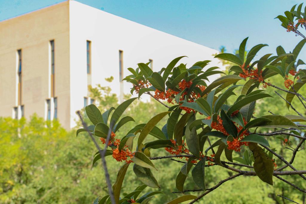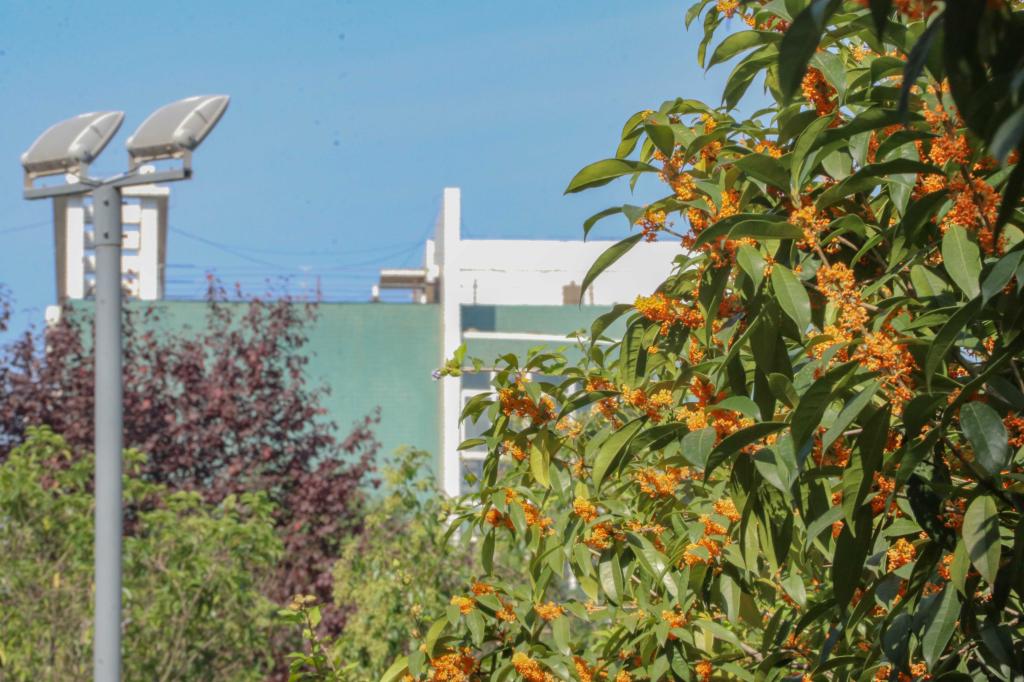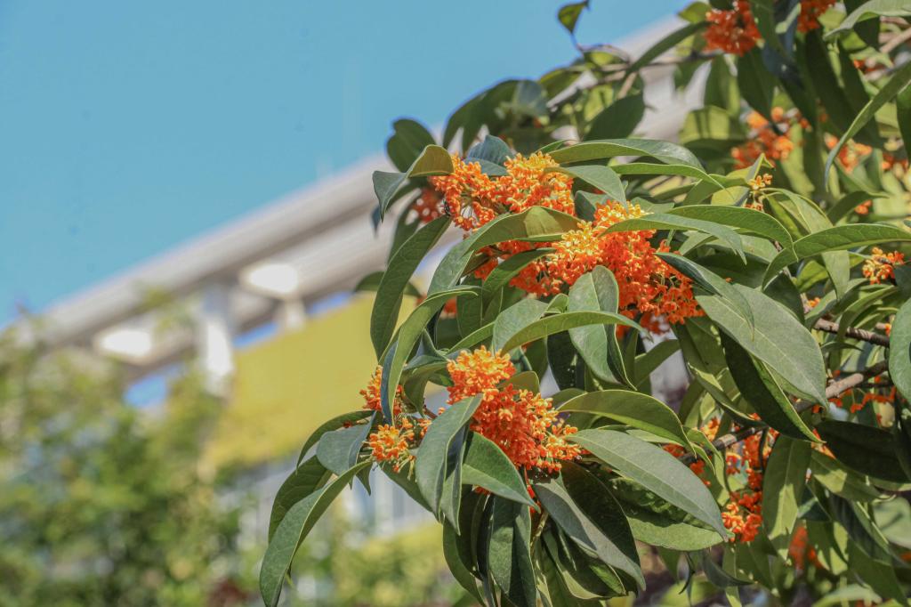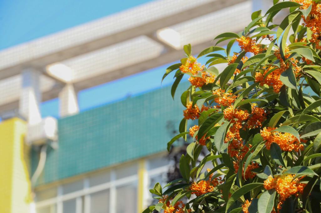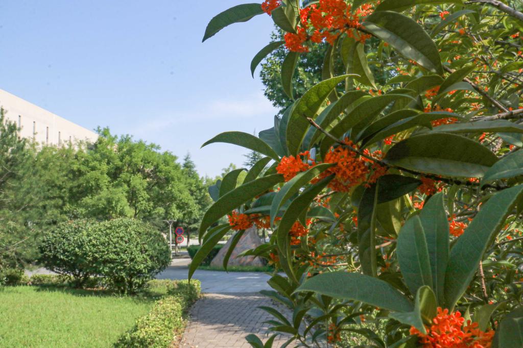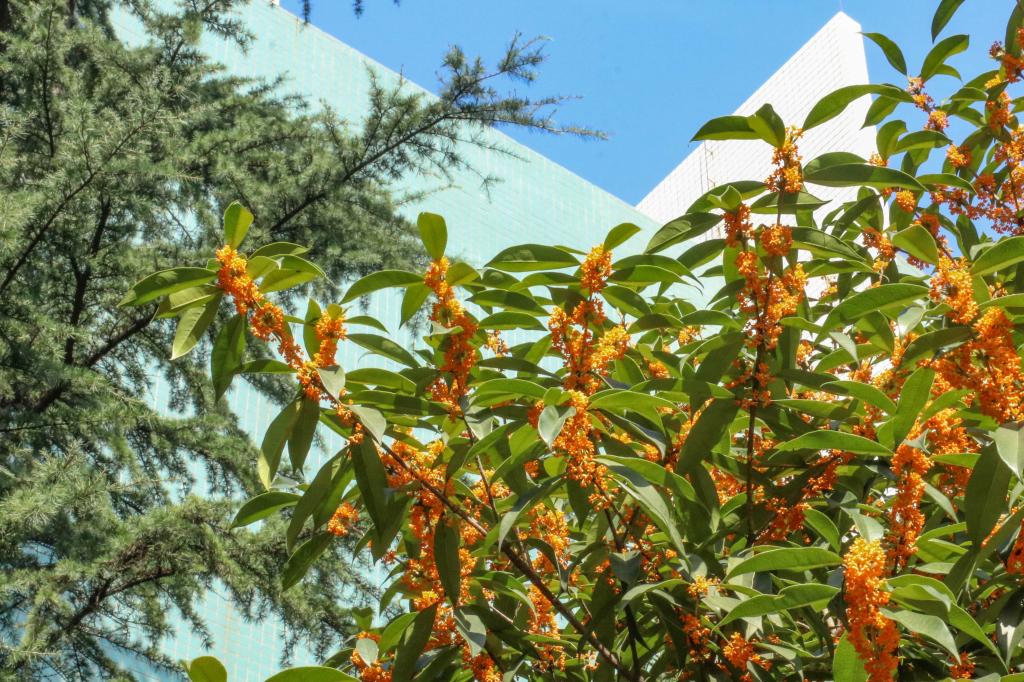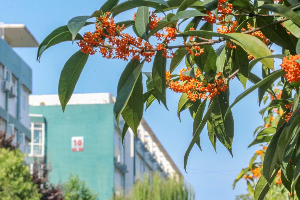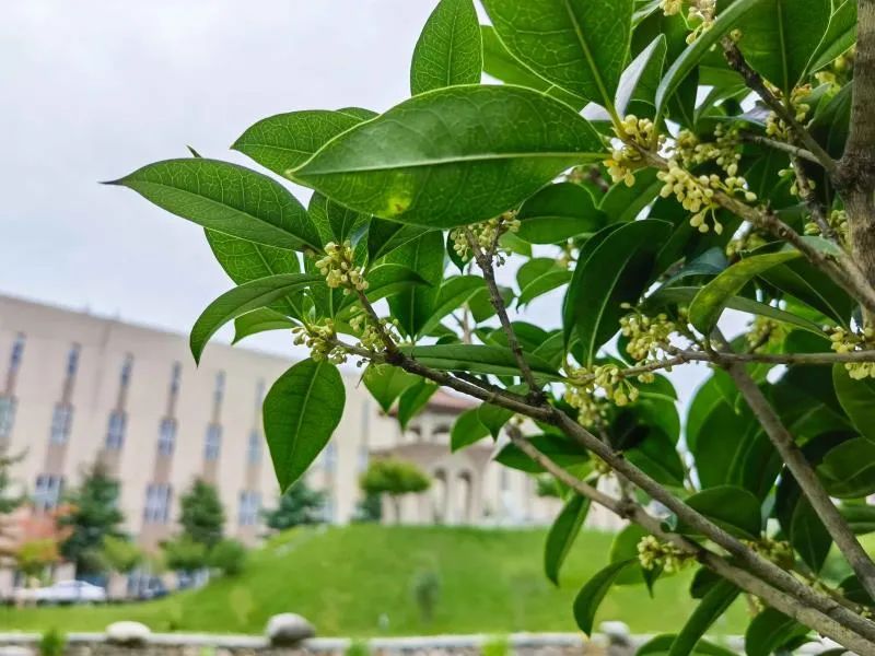 怕是秋天风露,染教世界都香。只是一点宫黄,却给人间送来这样芬芳,路过育英楼北侧,桂花随风摇曳,香飘十里。