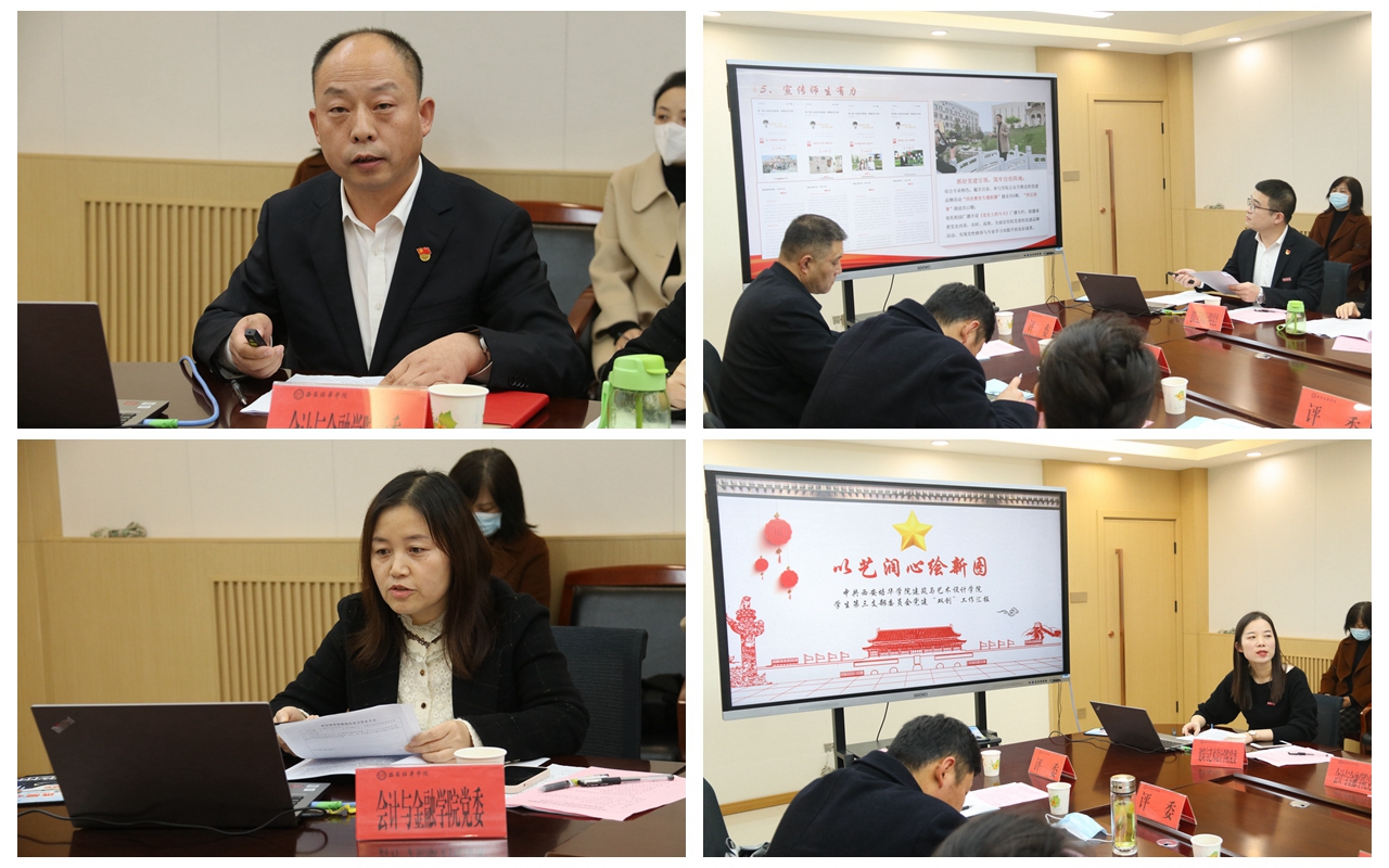 会计与金融学院党委书记史立军围绕“五个到位”,汇报学院党委在建设周期内各项工作开展情况。在两年的建设周期里,学院党委坚持从组织领导和工作机制、党建育人和方向聚焦、政治引领和思想工作等方面开展工作,始终着眼一流专业建设目标,以审核评估为核心,坚持求规范、树标杆、育人才、谋发展。传媒学院学生第五党支部书记魏浩亮紧扣“党建+专业”“四个育人”齐发力为特色进行汇报,汇报内容数据详实、照片真实生动。会计与金融学院教工第二党支部书记原亚丽介绍本支部两年来以一个支部为中心,四个团队为基础的工作方式,探索出了一套适合本支部管理的经验办法,将党建深度融入课程思政全过程。建筑与艺术设计学院学生第三党支部书记崔菲围绕“党建+专业”“党建+公寓”“党建+实践”三个方面进行汇报,立足基础党建实际,致力于将党支部打造成为党员成长、学习的坚强阵地。