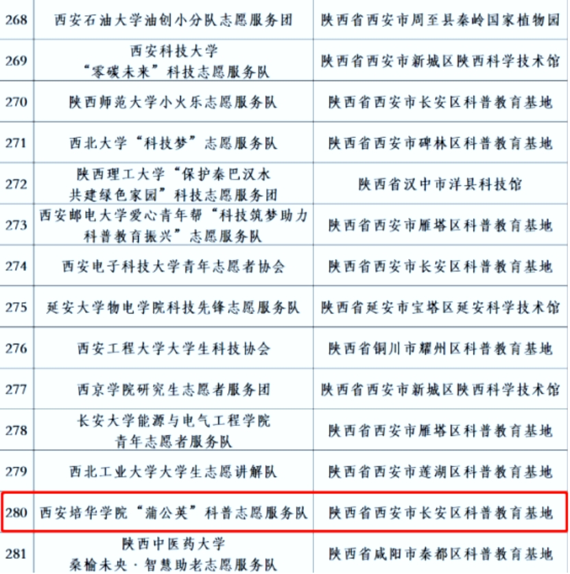学校校推荐的“蒲公英”科普志愿服务队(智能科学与信息工程学院申报)经过层层选拔,入选全国大学生科技志愿服务示范团队,这也是培华科普志愿服务在国家层面上零突破。该团队以西安市临潼区气象科普教育基地为主阵地,以“智能+信息+气象”为抓手,以学习及实践能力提升为总目标,开展志愿学习及实践服务相关活动。