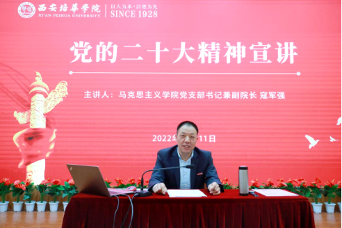 11月11日,西安培华学院举行“马院院长宣讲团”宣讲会,学校马克思主义学院副院长寇军强围绕二十大报告进行了系统的宣讲,通过线上线下相结合的形式,全校师生20000余人次参与。11月14日,学校特邀党的二十大代表,省妇联党组书记、主席王玉娥来校宣讲党的二十大精神,她鼓励青年学子要以时不我待的精神追求“大学问”,练就“大视野”,增长新本领、实现新作为,争当伟大理想的追梦人、伟大事业的建设者,让青春在全面建设社会主义现代化国家的火热实践中绽放绚丽之花。