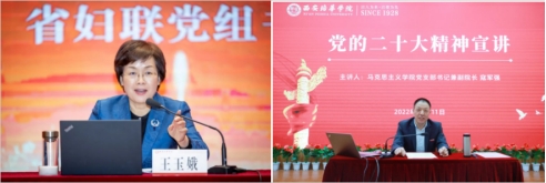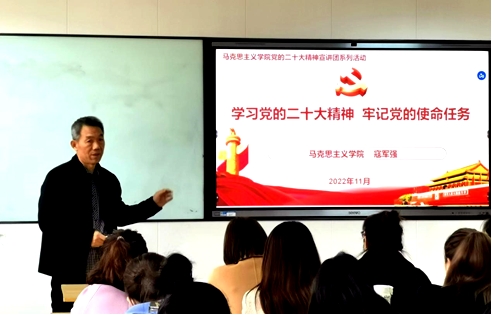 -- 坚持深入宣讲。马克思主义学院积极发挥思想引领作用和辐射作用,适时开展党的二十大精神宣讲活动。一是组织开展了党的二十大精神宣讲“马院院长宣讲团”活动,副院长寇军强为全校师生作线下+线上宣讲。成立了马克思主义学院专家教授、思政课“标兵”“能手”和青年骨干教师组成的党的二十大精神宣讲团,并以校党委的名义发文,面向全校各二级学院开展党的二十大精神宣讲,都在按计划进行中。二是联合校团委成立了学生讲师团。参加了“千马廿行”全国高校马克思主义学院青年学子联学联讲党的二十大精神系列活动,面向全校学生公开招募成员,组织宣讲团成员备课和培训,深入学习党的二十大报告、辅导读本、中央宣讲团报告等,有望培养、凝聚一批政治立场坚定、宣讲能力突出的讲师,共同打造出一批学习宣传贯彻党的二十大精神的示范“金课”。