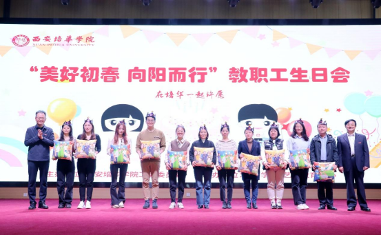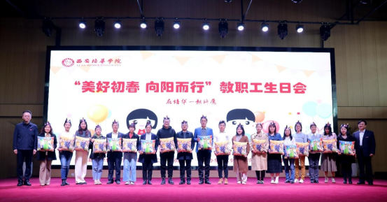 理事长姜波、校长李映方为寿星教职工们颁发生日礼物