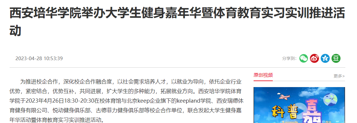 为推进校企合作,深化校企合作融合度,以社会需求培养人才,以就业为导向,依托企业行业优势,紧密结合,优势互补,共同进展,扩大学生的多种能力,拓展就业方向。西安培华学院体育学院于2023年4月26日18:30-20:30在校体育馆与北京keep企业旗下的keepland学院、西安瑞德体育健身有限公司、悦动健身俱乐部、古德菲力健身俱乐部等校企合作单位,联合发起大学生健身嘉年华活动暨体育教育实习实训推进活动。