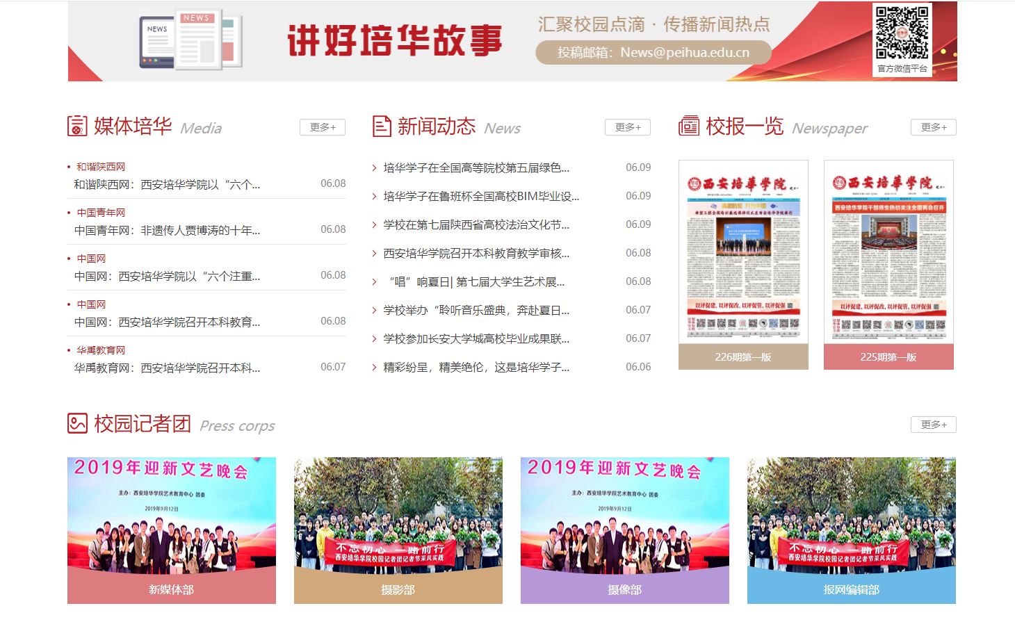 ——搭建平台,形成报媒矩阵传播。培华校报现已形成网站、微信、纸媒“三位一体”的平台矩阵。依托微信公众号“校媒联盟”“培华校报”“培华讯”、微信小程序“西安培华学院校报”等手机客户端平台,培华官网、培华学院新闻中心、校报电子报等网站平台,同时结合校报纸质媒介,强化渠道建设,形成强有力的媒体矩阵。近年来,培华校报微信开通网上看报、邀你“云”看报等内容专栏,强化校报生命力、扩大内容影响力、深化品牌传播力。组织学生团体派发校报,让校报走进教学楼、学生公寓、图书馆等校园场所,通过校际间交流,校企、校地间合作,传递校报价值,传播培华精神。