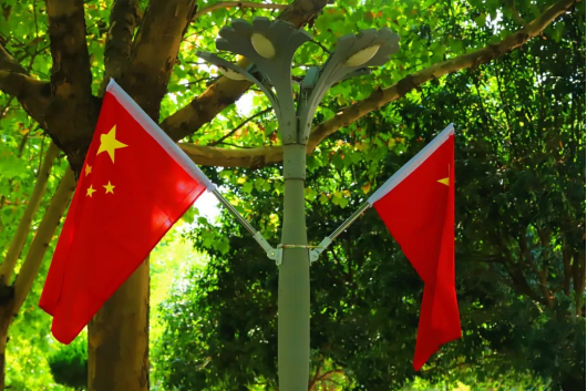 国庆前夕,校园各处悬挂着五星红旗,无人机也载着五星红旗飞扬。在培华上空,目光所至,皆为华夏,五星闪耀,皆为信仰。