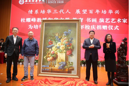 西安培华学院传媒学院院长杜耀峰教授在捐赠仪式上回顾他与培华三代办学人深厚情感时说到:“我为培华九十五周年校庆捐赠艺术品,出于三个原因,一是一直赞赏培华坚持近百年的办学宗旨,就是让没有社会地位、没有知识、没有条件念书的人到培华学知识,掌握技术,靠自己能力实现生存,提升自尊;二是我的三十六位硕士弟子赠我的珍贵红木老子雕像,篆刻着我教他们求学做人的标准:敬文惜米,专业立身,家国天下,使命忠贞。现在捐给培华,启迪在校学生守正创新,正确求学做人。三是我夫人绘制了油画,画题为《繁盛》,祝贺百年培华枝繁叶茂,盛世空前。捐赠这两件艺术品,也体现我的一种情怀。人不仅要兢兢业业做事,还必须具备自己的情怀,因为世界是由情怀编织起来的网络,不是冰冷的物理网线。培华学院从悲悯女子读书到现在一个完整的本科大学,骨子里起作用的正是全体培华人的情怀。”