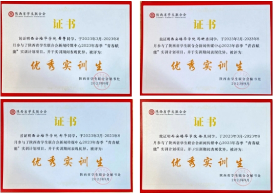 近日,共青团陕西省委、陕西省学生联合会发布了《2023年春季“青春赋能”计划实训证明》的通知,我校9位同学顺利完成陕西学联新媒体运营相关工作,获得实习证明。其中,徐灵、郑华、黄菁、冯妍乐4位同学,被评为“优秀实训生”。