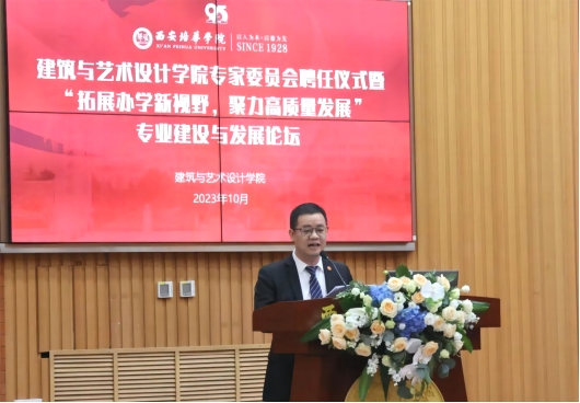 为庆祝西安培华学院建校95周年,助力学校及学院高质量发展,10月28日,由学校建筑与艺术设计学院主办的“专家委员会聘任仪式暨‘拓展办学新视野,聚力高质量发展’专业建设与发展论坛”在西安培华学院明德楼报告厅举行。西安培华学院理事长姜波,学术委员会主席、副校长刘越莲,专家委员会全体委员,企业与社会人士,学校各职能部门领导、学院领导、各专业负责人及学生代表共200余人参加。通过论坛交流分享建筑类、艺术类学科教学及发展的前沿信息,深入研究学科融合交叉和数字化转型下的教育教学工作,更好助力落实立德树人,服务区域创新发展,实现高质量发展。聘任仪式由学院党委书记兼行政副院长王飞主持,论坛由专家委员会秘书长杨志博士主持。