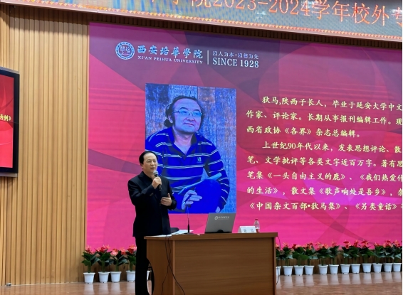 胡俊生常务副校长对狄马先生的到来表达了诚挚的欢迎和衷心的感谢,他肯定了狄马先生在文学方面的专业性和个人素养,并向参会人员介绍了狄马先生:狄马是一位有思想、有独立意识、不随波逐流的当代作家,上世纪90年代以来,发表思想评论、散文随笔、文学批评等各类文字近百万字。著有思想随笔集《一头自由主义的鹿》、《我们热爱什么样的生活》,散文集《歌声响处是吾乡》,杂文集《中国杂文百部?狄马集》、《另类童话》等。