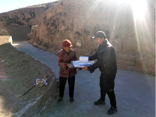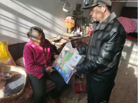 活动现场,工作人员主动上门为行动不便的老人送去慰问品,叮嘱老人在寒冬之际保重身体,将温暖带给孩子。