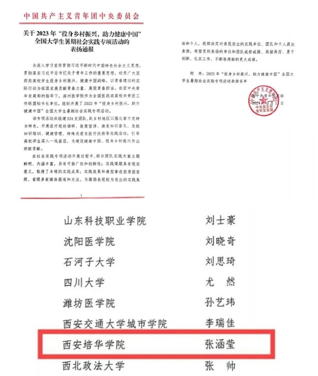 近日,团中央下发《2023年“投身乡村振兴,助力健康中国”全国大学生暑期社会实践专项活动表扬通报》,学校医学院张涵莹同学被评为“表现突出个人”。该活动由共青团中央青年发展部指导,全国医药类高校共青团工作联盟组织开展。
