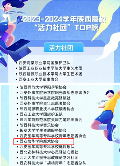 为进一步激发高校学生社团活力,发挥学生社团育人功能,在团中央基层建设部指导下,中国青年报开展了2023-2024学年高校“活力社团”风采展示活动,集中展示高校学生社团创新经验做法。经校级风采展示、审核推报及抖音“活动落地页”点赞推选,学校魔术协会入选2023-2024学年陕西高校“活力社团”TOP100榜。