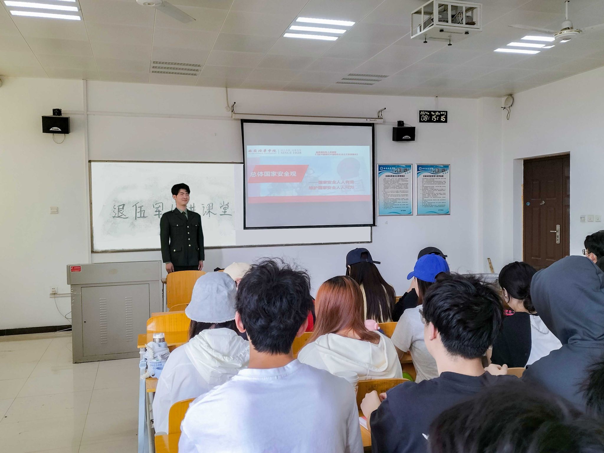 退伍大学生刘承俊结合第十三章维护和塑造国家安全的章节内容讲解了国家安全的重要性,分享了关于国家安全的相关案例,倡导同学们从自己做起,从小事做起,在平时日常生活中注意保守国家秘密。