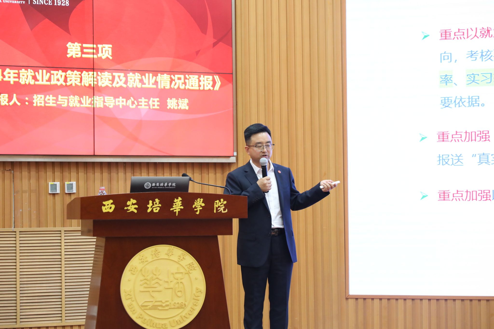 招生与就业指导中心主任姚斌以“抢抓求职关键期 千方百计促就业”为主题,作学校2024年就业形势分析、情况通报及就业重点工作解读,对2024年重点工作举措进行安排。