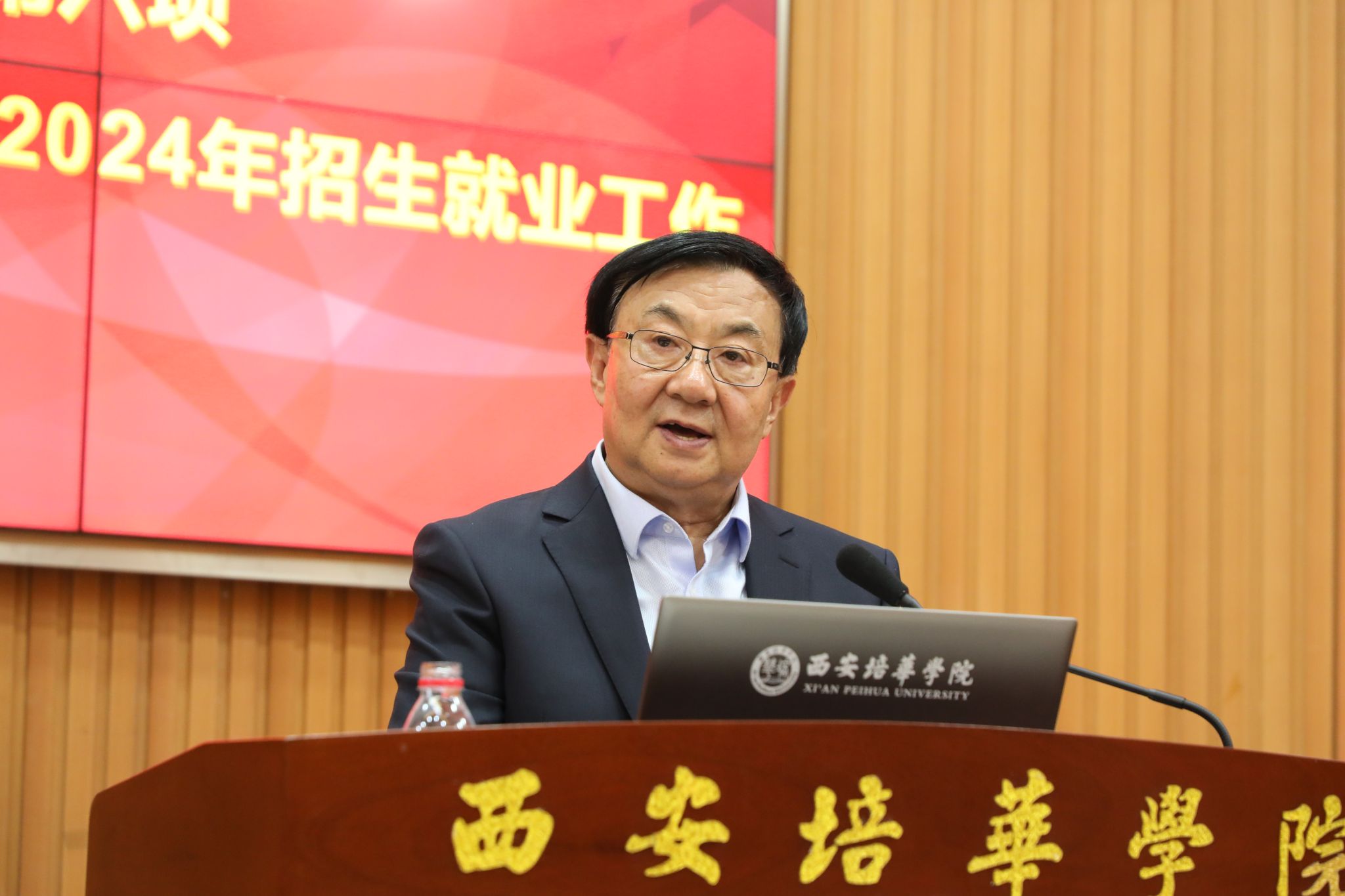 校长助理鲍伟作《数据赋能促改革,凝心聚力谱新篇》主题报告,他深刻剖析解读了2023年招生与就业数据,从生源结构、高考改革、毕业生结构规模、产教融合、“招培就”联动等十余个维度进行挖掘分析,汇报展示了培华过去一年招生工作成效。