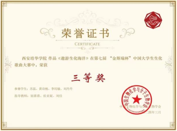 3月23日,由中国生物化学与分子生物学会教育专业分会主办、中山大学生命科学学院承办的=中国大学生第七届“金斯瑞杯”中国大学生生化歌曲大赛在中山大学落下帷幕。经过激烈角逐,由培华师生共同创作的生化歌曲《遨游生化海洋》荣获三等奖。