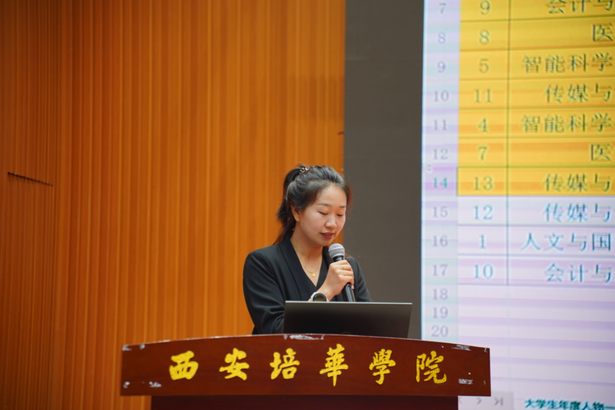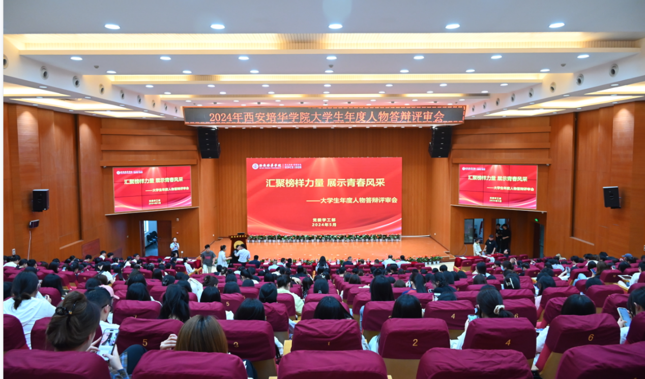 为深入学习贯彻习近平新时代中国特色社会主义思想和党的二十大精神,充分展示培华学子坚定不移听党话、跟党走,怀抱梦想又脚踏实地的精神风貌,激励广大青年学生立志做有理想、敢担当、能吃苦、肯奋斗的新时代好青年,5月9日,学校在维之图书馆召开2024年西安培华学院大学生年度人物答辩评审会。党委学工部副部长、学生服务中心副主任杨媛,校团委书记董莹,各二级学院党委(党总支)书记(副书记)、30名大众评审以及300名学生代表参加本次大会。会议由学生服务中心老师黄晨主持。
