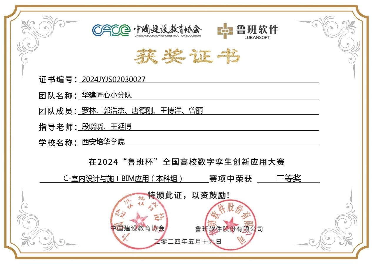 近日,中国建设教育协会举办的2024“鲁班杯”全国高校数字孪生创新应用大赛圆满落下帷幕。在此次赛事中,智能科学与工程学院邀请陕西建工第十一建设集团张旭春、中国建筑第七工程局王延博担任企业导师,师生高度重视,积极备赛,齐心协力、精诚合作,最终斩获国家级团体三等奖4项。段晓晓、翟颖、张旭春、王延博4名教师获得“优秀指导教师”的荣誉称号。