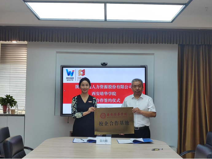 为深化校企合作,拓展毕业生就业渠道,进一步推进“访企拓岗”行动,7月2日,西安培华学院与陕西易通人力资源股份有限公司举行校企合作基地签约暨授牌仪式。陕西易通人力资源股份有限公司总经理刘晓平、副总经理陈晓仓,学校副校长姚文静、招生与就业指导中心主任姚斌、副主任王琳及双方相关工作人员参加签约仪式。