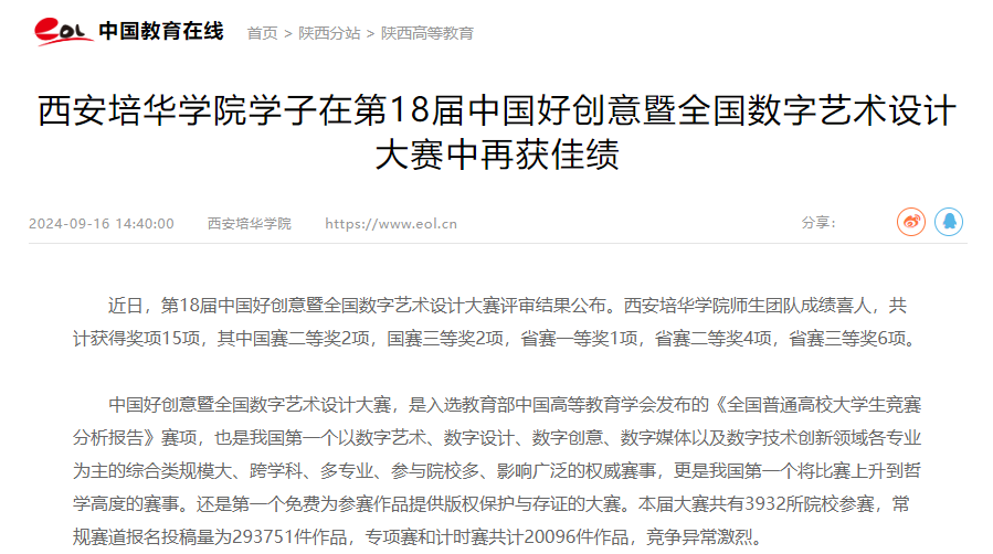 近日,第18届中国好创意暨全国数字艺术设计大赛评审结果公布。西安培华学院师生团队成绩喜人,共计获得奖项15项,其中国赛二等奖2项,国赛三等奖2项,省赛一等奖1项,省赛二等奖4项,省赛三等奖6项。