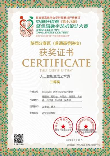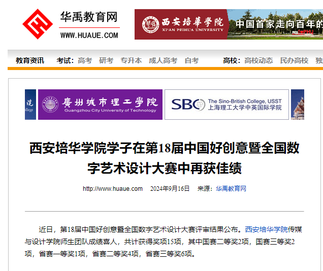 近日,第18届中国好创意暨全国数字艺术设计大赛评审结果公布。西安培华学院传媒与设计学院师生团队成绩喜人,共计获得奖项15项,其中国赛二等奖2项,国赛三等奖2项,省赛一等奖1项,省赛二等奖4项,省赛三等奖6项。