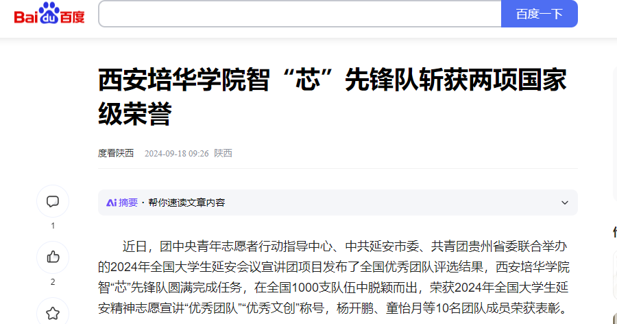 近日,团中央青年志愿者行动指导中心、中共延安市委、共青团贵州省委联合举办的2024年全国大学生延安会议宣讲团项目发布了全国优秀团队评选结果,西安培华学院智“芯”先锋队圆满完成任务,在全国1000支队伍中脱颖而出,荣获2024年全国大学生延安精神志愿宣讲“优秀团队”“优秀文创”称号,杨开鹏、童怡月等10名团队成员荣获表彰。