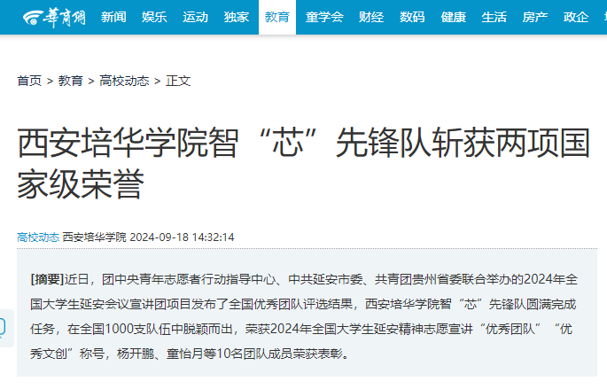 近日,团中央青年志愿者行动指导中心、中共延安市委、共青团贵州省委联合举办的2024年全国大学生延安会议宣讲团项目发布了全国优秀团队评选结果,西安培华学院智“芯”先锋队圆满完成任务,在全国1000支队伍中脱颖而出,荣获2024年全国大学生延安精神志愿宣讲“优秀团队”“优秀文创”称号,杨开鹏、童怡月等10名团队成员荣获表彰。