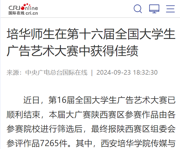 近日,第16届全国大学生广告艺术大赛已顺利结束,本届大广赛陕西赛区参赛作品由各参赛院校进行筛选后,最终报陕西赛区组委会参评作品7265件。其中,西安培华学院传媒与设计学院报送作品146件,获奖71项。荣获国家级三等奖2项,国家级优秀奖2项,陕西省赛区一等奖10项、二等奖14项,三等奖15项,优秀奖28项。西安培华学院荣获“优秀院校奖”,童瑾获“优秀组织工作者”,王卓、张琨、韩旭、曲少为、张荣花、房宁、刘妙、李昕萌、邱晓波、曲少为、郑晓利、吴兰兰、张晓露、尚勇获得“优秀指导教师”称号。