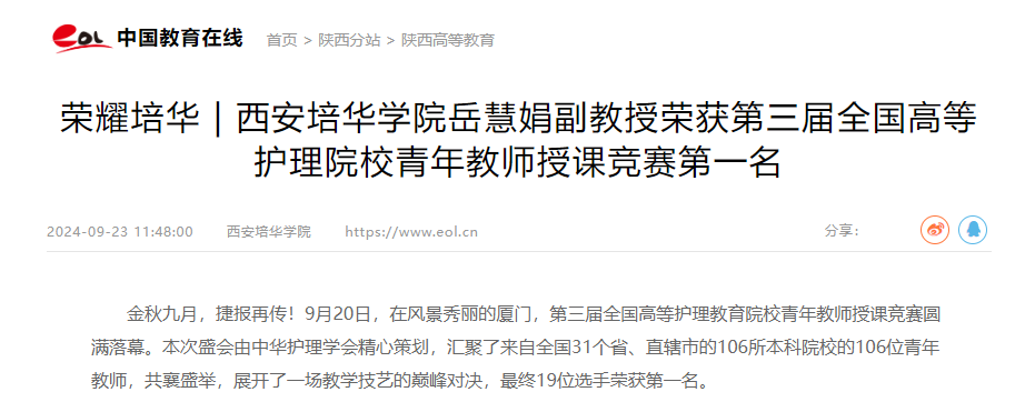金秋九月,捷报再传!9月20日,在风景秀丽的厦门,第三届全国高等护理教育院校青年教师授课竞赛圆满落幕。本次盛会由中华护理学会精心策划,汇聚了来自全国31个省、直辖市的106所本科院校的106位青年教师,共襄盛举,展开了一场教学技艺的巅峰对决,最终19位选手荣获第一名。