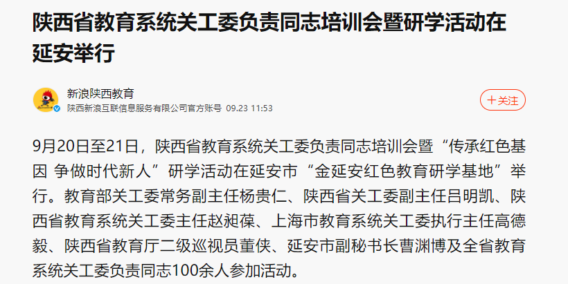9月20日至21日,陕西省教育系统关工委负责同志培训会暨“传承红色基因 争做时代新人”研学活动在延安市“金延安红色教育研学基地”举行。教育部关工委常务副主任杨贵仁、陕西省关工委副主任吕明凯、陕西省教育系统关工委主任赵昶葆、上海市教育系统关工委执行主任高德毅、陕西省教育厅二级巡视员董侠、延安市副秘书长曹渊博及全省教育系统关工委负责同志100余人参加活动。