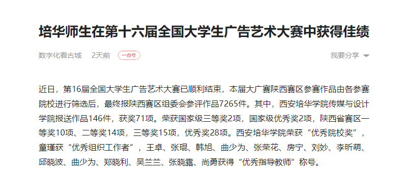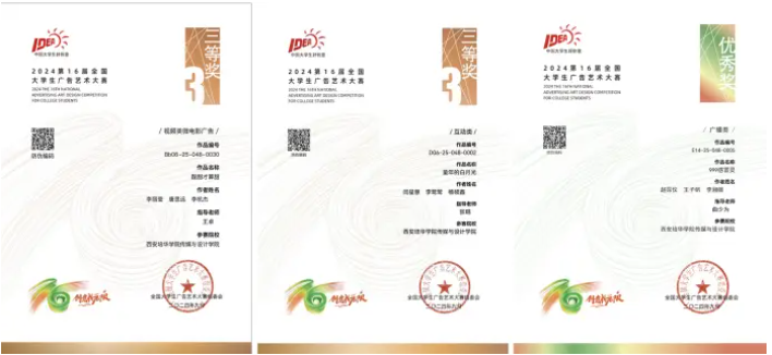 近日,第16届全国大学生广告艺术大赛已顺利结束,本届大广赛陕西赛区参赛作品由各参赛院校进行筛选后,最终报陕西赛区组委会参评作品7265件。其中,西安培华学院传媒与设计学院报送作品146件,获奖71项。荣获国家级三等奖2项,国家级优秀奖2项,陕西省赛区一等奖10项、二等奖14项,三等奖15项,优秀奖28项。西安培华学院荣获“优秀院校奖”,童瑾获“优秀组织工作者”,王卓、张琨、韩旭、曲少为、张荣花、房宁、刘妙、李昕萌、邱晓波、曲少为、郑晓利、吴兰兰、张晓露、尚勇获得“优秀指导教师”称号。